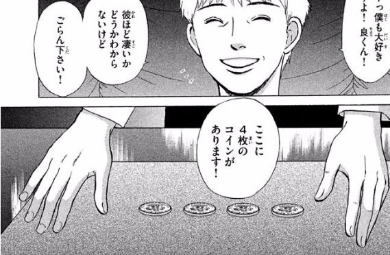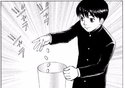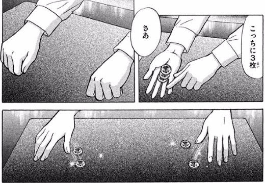 続いてのマジックは、コインマジックです。 「マイザーズ・ドリーム」。欲張りの夢 という意味です。 人によって色々な手順がありますが、とにかくコインが色んな所から現れたり、増えて増えて増えまくったりします。 8巻で人間国宝緒川幸正先生の前でご披露したマジックです。 psykaさんはカップを使ってやってみせてくださいました。 お客さんの頭とか耳の横などからどんどんコインを取り出して見せます。 どうも、コインを取り出すならいくらでも続けていられるらしいですよ? 手からコインがじゃらじゃら落ちてきます! まだまだ落ちてきます! そして、このコップをまたコインが下から上へ通り抜けたり… 上から下へ通り抜けたりします。(写真わかりにくくすみません) そして、7巻で桜木さんがやっていた手を握って開くとコインが移動するのもやってくれました。 写真ではその動きが全然説明出来ませんが… こんな流れの後で… いつの間にか持っていたはずのコインも全てコップの中へ。 いつの間にー! 次に、またカードに戻ります。 一枚、マークしたカードを入れておくと、手を鳴らすと必ず出てくる、というマジックです。 一枚にサインしておきます。 で、トランプのデックの中にまぜて、指をならすと… なぜかポケットに入ってる。 これを何度かやって、種明かしで実はこれは一枚のカードを隠し持っていて、ポケットに手を入れた時にいかにもあったというように出してるんですよー、と言うんですが… (隠し持つやり方はこちら。1巻・パーム) この後、自分ではポケットに手をいれないで、杉本先生がポケットを探ってもこのカードが入ってたりします。明らかに今入れたわけじゃない! 最後に、もう一度指を鳴らしてポケットを先生に探ってもらったら、やっぱりカードが出てきた…んだけど、選んだのとは違うカード? と思ったら、どんどん他のカードも出てきて… 実はいつの間にか手には選んだカードだけが残っている! ポケットにはその他全部のカードが入っていたのでした!! 本当に一体いつこうなったのでしょう?? そして、最後にカップ&ボールです。 9巻の最後に飛行機の中で子供にやってあげるシーンがありますので、どうぞ発売したての9巻ラストを御覧ください! 8巻でもやっていますね! カップとボールをお客さんに改めて貰った後、ボールをカップの中に入れて、手を握っているといつの間にか手の中にボールが移動していたり、今度はボールがカップの中に入ったり、人にカップをあけてもらったらやっぱり入っていたり…などなど そして、最後にカップからこのボールが出てくるのかと思いきや… あれ?大きいボールが出てきてしまいました! ここで拍手喝采、みんなこれでラストだ…と思っていた所 もう一個大きいのが出てきました!!! 大歓声でマジックショーは終了です!! (メモ等取っていなかったのでもしかしたら内容に多少間違いがありましたらすみません) この後杉本先生サイン会になりました。 (こっちが本題) |