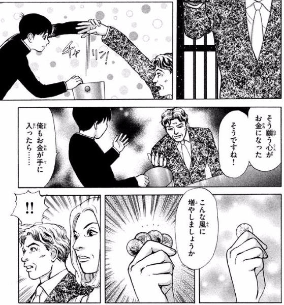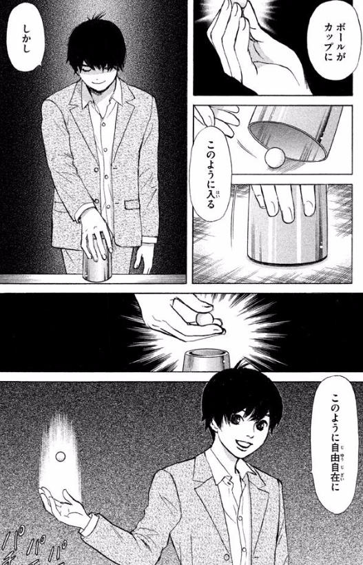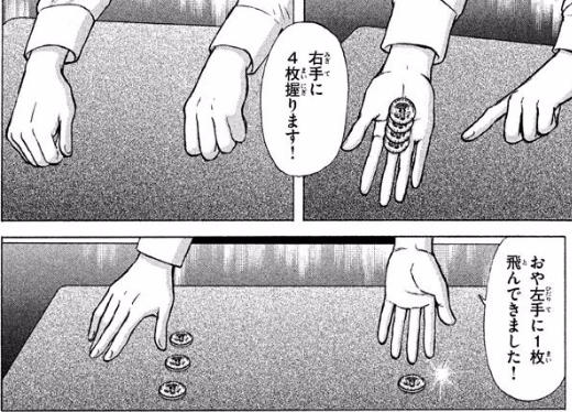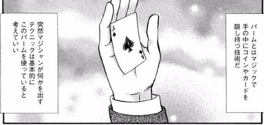 続いてのマジックは、コインマジックです。 「マイザーズ・ドリーム」。欲張りの夢 という意味です。 人によって色々な手順がありますが、とにかくコインが色んな所から現れたり、増えて増えて増えまくったりします。 8巻で人間国宝緒川幸正先生の前でご披露したマジックです。 psykaさんはカップを使ってやってみせてくださいました。 お客さんの頭とか耳の横などからどんどんコインを取り出して見せます。 どうも、コインを取り出すならいくらでも続けていられるらしいですよ? 手からコインがじゃらじゃら落ちてきます! まだまだ落ちてきます! そして、このコップをまたコインが下から上へ通り抜けたり… 上から下へ通り抜けたりします。(写真わかりにくくすみません) そして、7巻で桜木さんがやっていた手を握って開くとコインが移動するのもやってくれました。 写真ではその動きが全然説明出来ませんが… こんな流れの後で… いつの間にか持っていたはずのコインも全てコップの中へ。 いつの間にー! 次に、またカードに戻ります。 一枚、マークしたカードを入れておくと、手を鳴らすと必ず出てくる、というマジックです。 一枚にサインしておきます。 で、トランプのデックの中にまぜて、指をならすと… なぜかポケットに入ってる。 これを何度かやって、種明かしで実はこれは一枚のカードを隠し持っていて、ポケットに手を入れた時にいかにもあったというように出してるんですよー、と言うんですが… (隠し持つやり方はこちら。1巻・パーム) この後、自分ではポケットに手をいれないで、杉本先生がポケットを探ってもこのカードが入ってたりします。明らかに今入れたわけじゃない! 最後に、もう一度指を鳴らしてポケットを先生に探ってもらったら、やっぱりカードが出てきた…んだけど、選んだのとは違うカード? と思ったら、どんどん他のカードも出てきて… 実はいつの間にか手には選んだカードだけが残っている! ポケットにはその他全部のカードが入っていたのでした!! 本当に一体いつこうなったのでしょう?? そして、最後にカップ&ボールです。 9巻の最後に飛行機の中で子供にやってあげるシーンがありますので、どうぞ発売したての9巻ラストを御覧ください! 8巻でもやっていますね! カップとボールをお客さんに改めて貰った後、ボールをカップの中に入れて、手を握っているといつの間にか手の中にボールが移動していたり、今度はボールがカップの中に入ったり、人にカップをあけてもらったらやっぱり入っていたり…などなど そして、最後にカップからこのボールが出てくるのかと思いきや… あれ?大きいボールが出てきてしまいました! ここで拍手喝采、みんなこれでラストだ…と思っていた所 もう一個大きいのが出てきました!!! 大歓声でマジックショーは終了です!! (メモ等取っていなかったのでもしかしたら内容に多少間違いがありましたらすみません) この後杉本先生サイン会になりました。 (こっちが本題) |