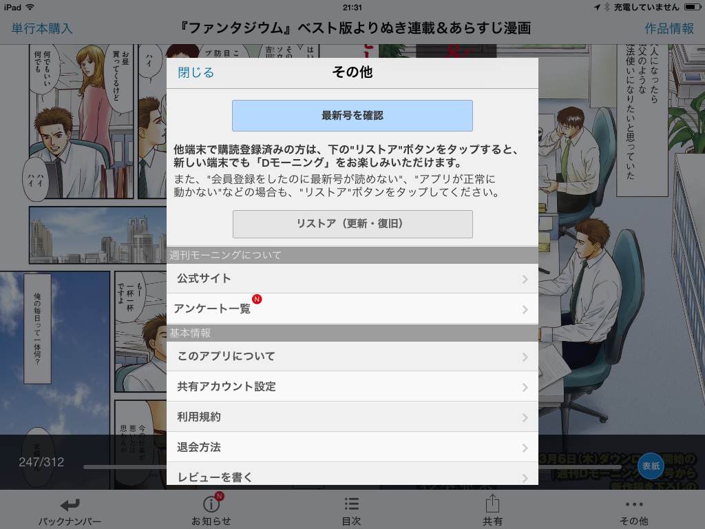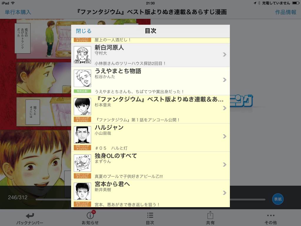 Dモーニング見ていただけましたか? 本日公開のDモーニングでも、ファンタジウムよりぬき連載が掲載されています! しかもこのようにソシオがあらすじを解説してくれてます! なぜか私の料理の腕がなかなかなところを強調してくれてます!そう、上手いんですよ。 (このあらすじは一部です) そして、カラーページもこうしてそのまま掲載されています。(これは2-3ページ目) 紙の本と違って、のどの部分が見えないということなく見開きで見ることができるのは電子ならではですね。拡大もできますよ! よくよく見るとカラーにテクスチャがひいてあることなど細かいところまで見ることができると思います(笑) 今回はThe Last Unicorn。コミックスでいうと4巻冒頭のお話です。 良がマジックで活躍し始めて、これからどう活動していこうかというところです。ガンテツさんも初登場です! 読んだことのない方もぜひこの機に、読んだことがある方は復習の意味で。 ぜひ読んでみてください! |